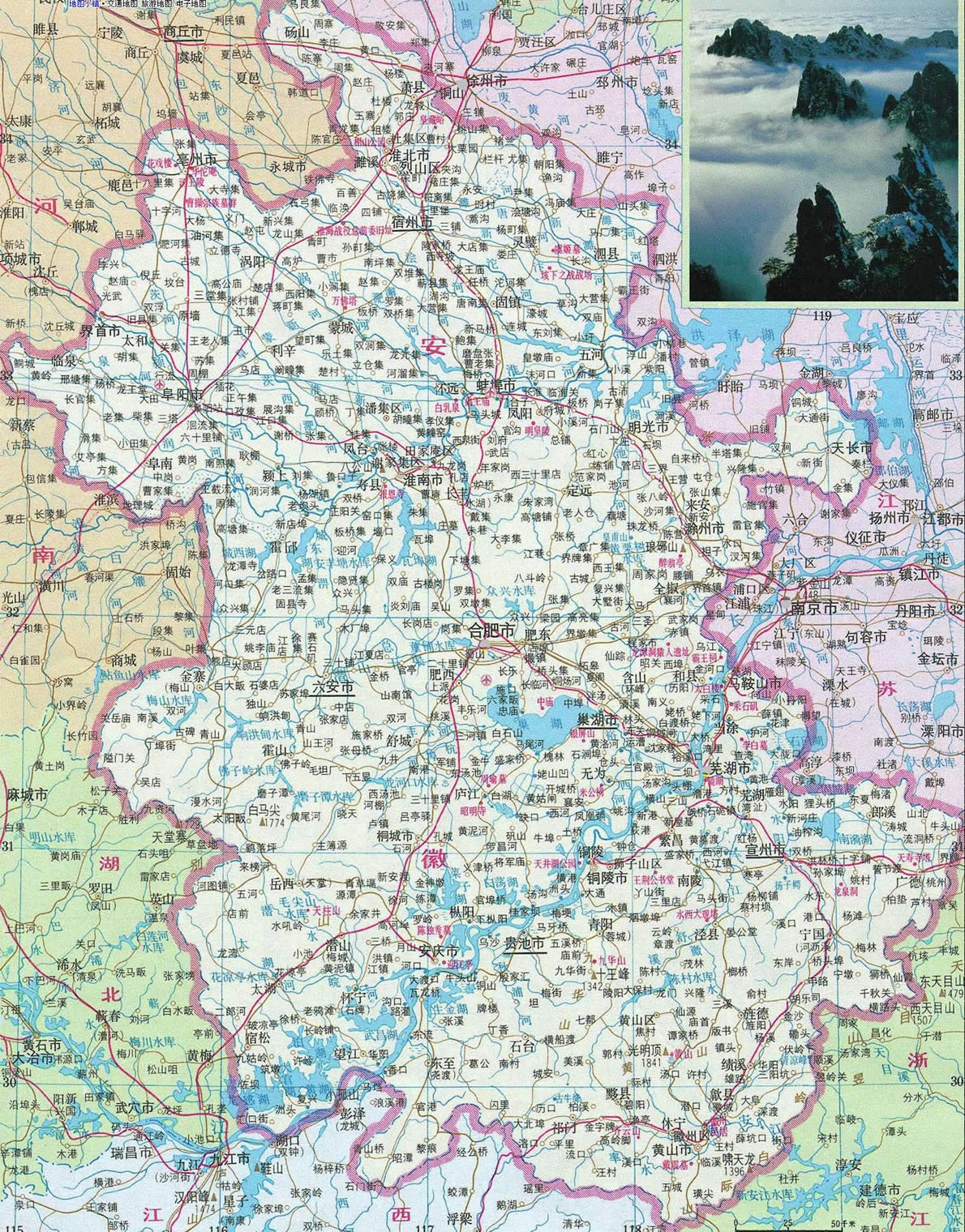 “兩根筷子夾著碗,屏障在西也在南,東面不平北邊平,黃山勝過九華山。”這首民謠形象地概括了安徽省的旅游地理面貌。兩條江河(長江和淮河)像兩根筷子,巢湖如碗,西面的大別山和東南面的天目山如屏,北邊是一馬平川的江淮大平原。而皖南的黃山、九華山則是安徽最有名的風(fēng)景名勝區(qū)。