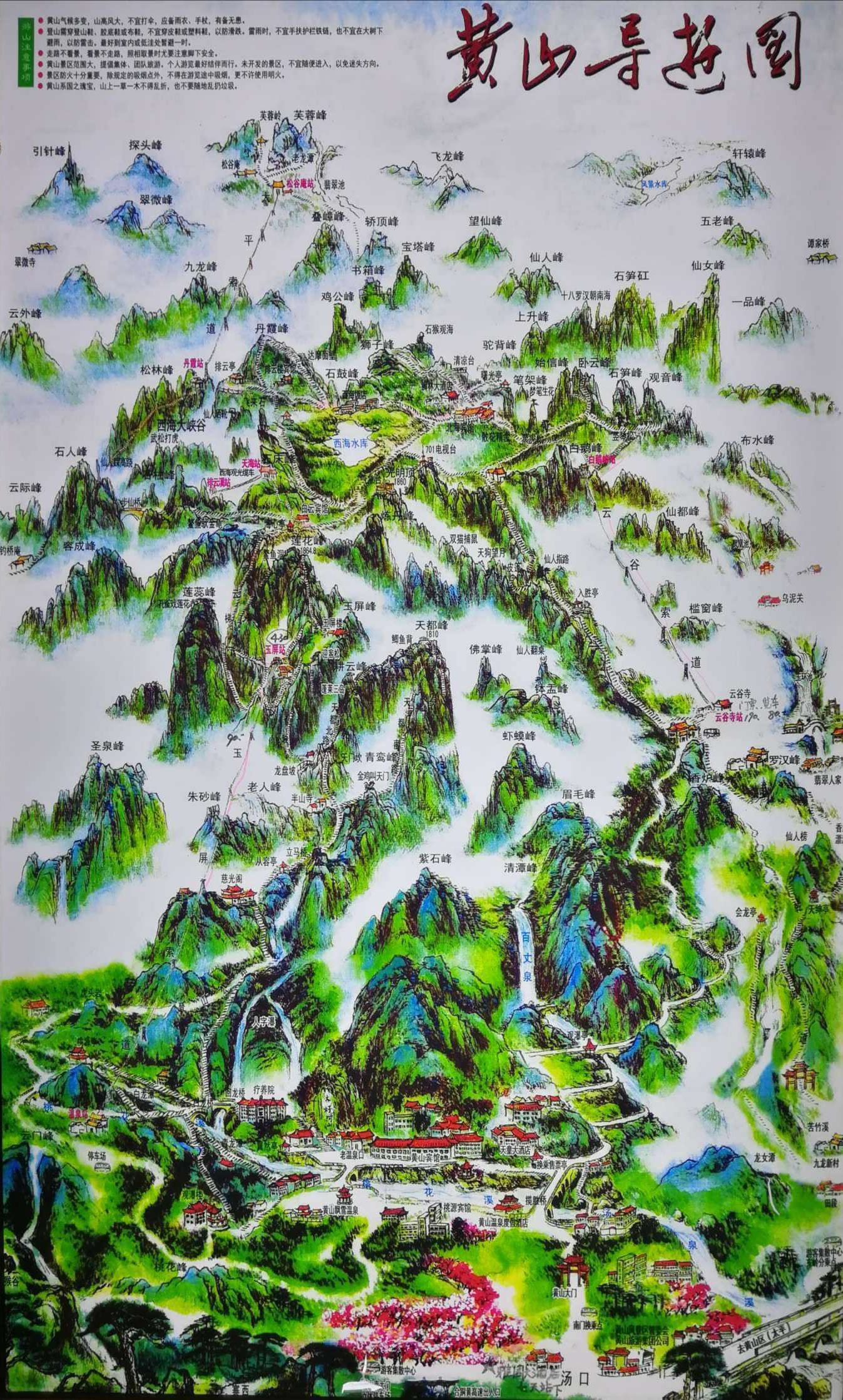 始信峰,從黑虎松進(jìn)入依次有黑虎松,連理松,龍爪松,在觀景臺(tái)前方有石筍峰,石筍峰遠(yuǎn)眺有觀音漂海。觀景臺(tái)左有臥云峰,臥云峰上有探海松,臥龍松,觀景臺(tái)右行10米有豎琴松(轅門(mén)松),觀景臺(tái)左行去始信峰頂邊有接引松,始信峰頂有聚音松。