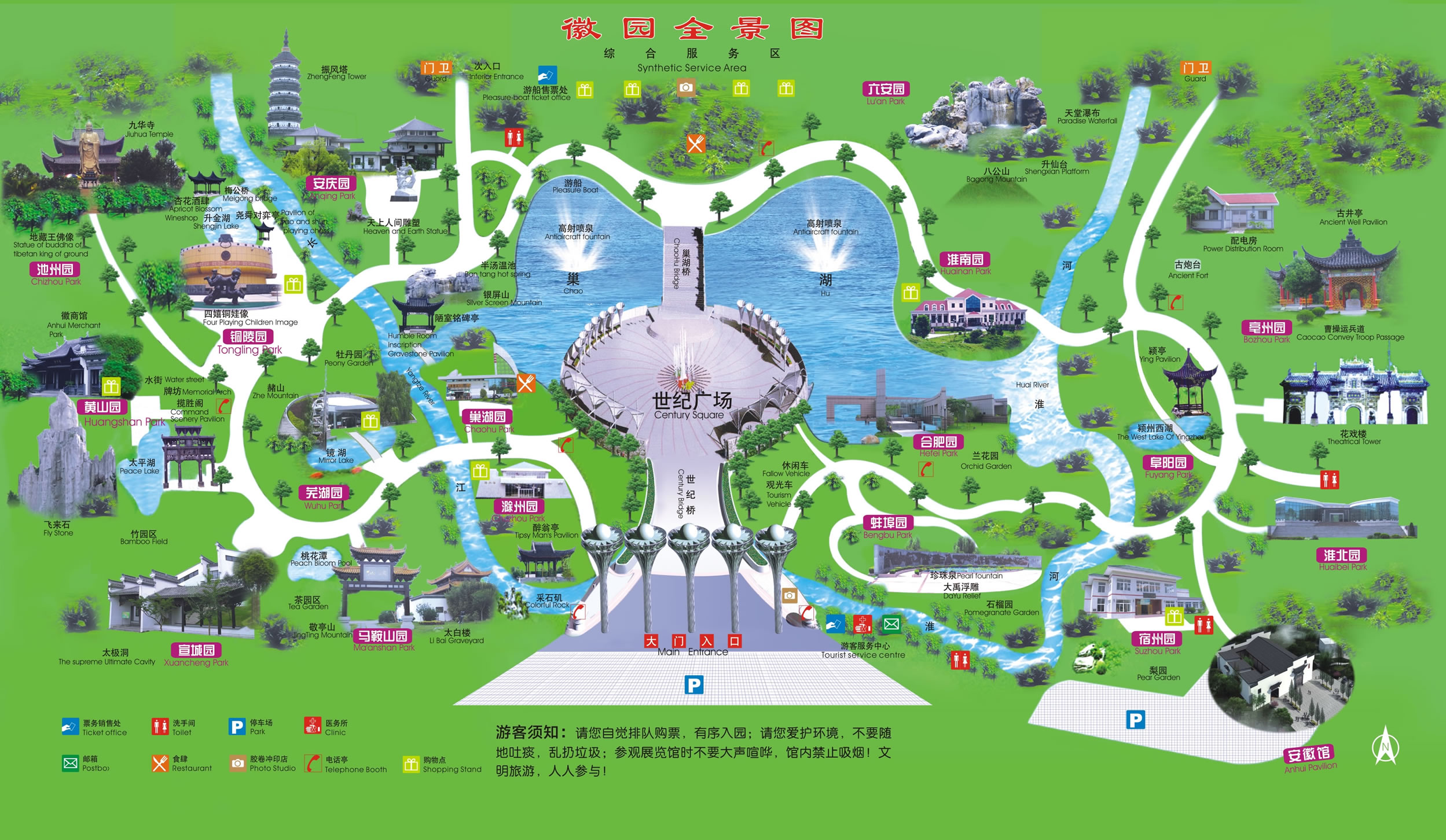 徽園位于安徽省合肥市蜀山區(qū)繁華大道276號,始建于1999年,占地面積20公頃,以安徽行政區(qū)劃為基本框架,全省16個(gè)地級市在相應(yīng)的區(qū)位均建有自己的館園;請@東部是皖北園區(qū),西部是皖南園區(qū),東西分別是“淮河”、“長江”,世紀(jì)橋通往世紀(jì)廣場,世紀(jì)廣場為橢圓形,占地面積1公頃,圍繞世紀(jì)廣場的看臺,呈階梯形,面對彩色噴泉和寬廣水面。園區(qū)從東到西環(huán)形布置為,大門、蚌埠園、合肥園、宿州園、淮北園、亳州園、阜陽園、淮南園、六安園、安慶園、銅陵園、池州園、黃山園、宣城園、馬鞍山園、蕪湖園、巢湖園、滁州園。