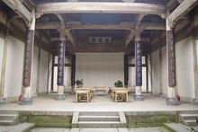 前廳是整幢房子中最精華的部分,大門后面聳立著一幅威儀的中門,在中門“!弊值纳戏剑傆幸环镜瘛鞍僮郁[元宵”圖,圖上雕刻著100個小男孩過元宵鬧花燈時的情景,這正是古代“多子多!眰鹘y(tǒng)觀念的生動寫照,“百子鬧元宵”圖兩邊的“商”字斗拱上則分別雕有四出《三國演義》的戲文,斗拱的上方雕有“南、北”財神,“南、北”財神的上方是閣樓護板,在此,汪定貴設(shè)計了“漁、樵、耕、讀”四根木雕立柱,分別代表了古代的四種職業(yè)。