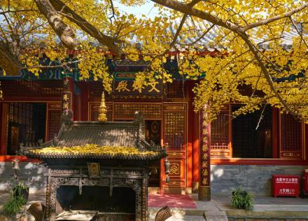 此為八大處一大勝景。霜秋一到,三山之上的黃櫨樹(shù)、火炬樹(shù)、元寶楓以及柿子樹(shù)、核桃樹(shù)和山花椒等等,黃時(shí)薄山碎,金迎風(fēng)閃爍,紅時(shí)又如二月鮮花處處流丹。有橡樹(shù)、青松翠柏,赤橙。