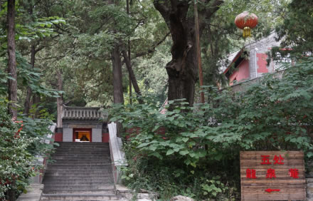 出秘魔崖,沿證果寺門(mén)前小盤(pán)道下行至南面水井,此處樹(shù)木成林,茂密非常,且均高大參天。日出東坡,光照林梢之時(shí),愈發(fā)覺(jué)得明暗濃淡別有意趣。唐詩(shī)所詠:“清晨入古寺,初日照高林”似不啻此處之景。