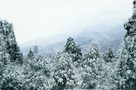 “西山晴雪”為燕山八景之一。然翠微、平坡、盧師三山亦屬西山之脈,此處峰巒起伏,溝壑縱橫,殿塔儼然。冬日瑞雪初霽,一派銀裝素裹。