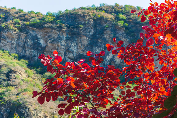 坡峰嶺景區(qū)春天時(shí)黃櫨花開(kāi),"三千粉色,花明如繡",滿樹(shù)毛絨的粉紅色黃櫨花傾灑在山谷中,層層迭迭,如粉色霧靄,置身其中如夢(mèng)似幻。秋天時(shí)漫山紅葉,"紅葉綠中游,彩練當(dāng)空舞",種類豐富的植物資源使這里成為流動(dòng)的色彩海洋,猶如一幅波瀾壯闊的紅葉畫(huà)卷。