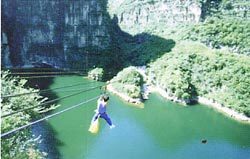 溜索飛降是登山探險運(yùn)動中,在通過懸崖、山澗、河流等地形時常用一種方法,F(xiàn)飛降裝置是經(jīng)改進(jìn)后,既安全又富有刺激,它容實用性和娛樂性于一體,在有驚無險的情況下,既鍛煉了參與者的操作技能,又增強(qiáng)了他們的膽魄。龍慶峽飛降由國家登山隊承建,主要設(shè)備全部進(jìn)口材料,安全可靠,該項目在風(fēng)景怡人的龍慶峽內(nèi)兩山懸崖之間,上有藍(lán)天,下有碧水全長200米,兩山自然落差30米的下滑時可使娛樂者感受到在空中飛越的感覺。