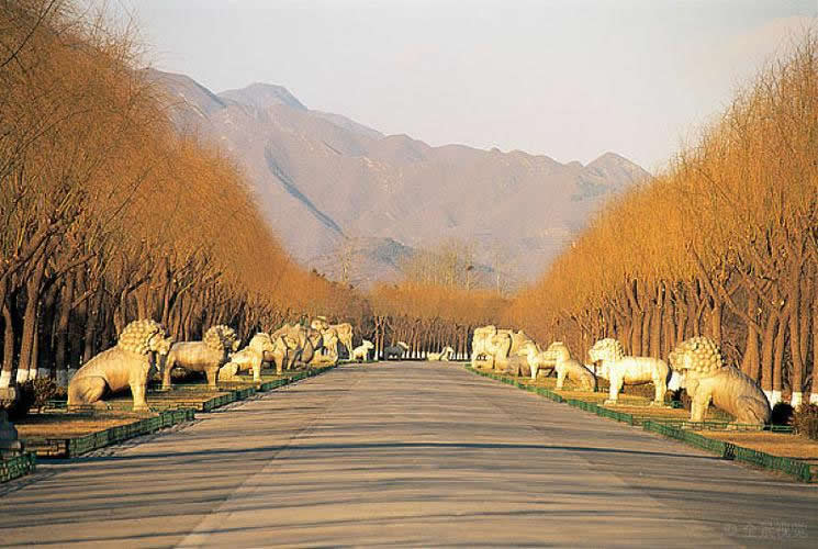 欞星門又叫龍風(fēng)門。由四根石柱構(gòu)成三個(gè)門洞,門柱類似華表,柱上有云板、異獸。在三個(gè)門額枋上的中央部分,還分別飾有一顆石雕火珠,因而該門又稱“火焰牌坊”。龍鳳門西北側(cè),原建有行宮,是帝后祭陵時(shí)的歇息之處。,但后來便成了全陵區(qū)的主陵道了。該道縱貫陵園南北,全長7公里,沿線設(shè)有一系列建筑物,錯(cuò)落有致,蔚為壯觀。