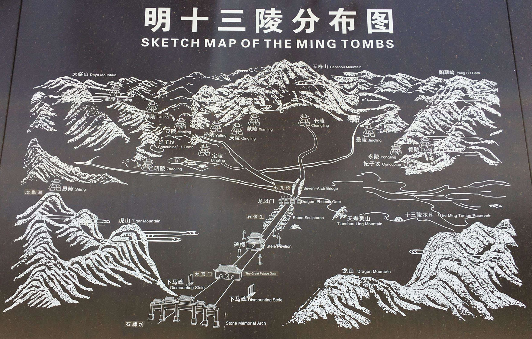 陵區(qū)內(nèi)共計(jì)葬有皇帝13人、皇后23人、皇貴妃1人,以及數(shù)十名殉葬貴妃。除皇帝陵外,陵區(qū)內(nèi)還有明朝妃子園寢七座,太監(jiān)墓一座,以及神宮監(jiān)、祠祭署等若干附屬建筑,形成了體系完整、規(guī)模宏大、氣勢磅礴的陵寢建筑群,成為世界上保存完整、埋葬皇帝最多的帝王墓葬群。