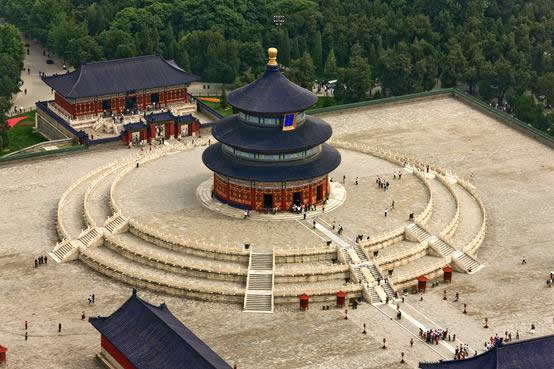天壇公園由兩道壇墻環(huán)繞,被分為“內(nèi)壇”“外壇”兩部分;域北呈圓形,南為方形,寓意“天圓地方”;主要由春季祈禱豐年的“祈谷壇”,冬至日祭天的“圜丘壇”,皇帝祭祀前居住的齋宮、演習(xí)祭祀禮樂的神樂署四大古建筑群組成;祈谷壇中的祈年殿是北京市的標(biāo)志性建筑。天壇公園外壇種植有大量古柏林。