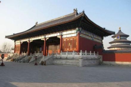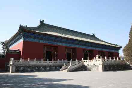 無梁殿:即齋宮正殿,建于明永樂十八年(1420年)。此殿因以磚拱承重,不用梁枋而得名;实圻M出齋宮均在此舉行有關(guān)禮儀。現(xiàn)殿內(nèi)按乾隆時期原貌陳列,橫額“欽若昊天”為乾隆御筆,屏風(fēng)、寶座均為原物。