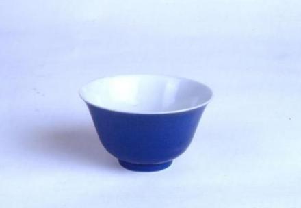 瓷質(zhì)。撇口,弧腹,深腹平底,圈足。器身外施祭藍(lán)釉,內(nèi)施白釉。純素。底書青花“大清光緒年制”六字雙行楷書款。