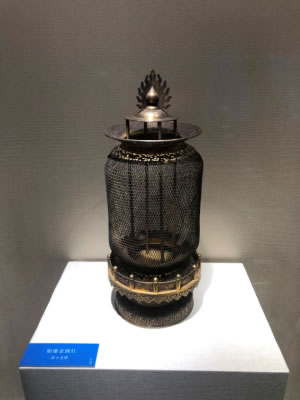 鍍金銀質(zhì)。由燈罩、燈座兩部分組成,整體圓柱籠形,罩、座可拆分。圓須彌座,浮雕卷草紋、蓮瓣紋,座臺欄桿上下鏤刻如意云紋欄板、掛落。座臺中心4柱燈提,貫穿于燈罩內(nèi),柱頂三叉火焰珠。燈罩用軟金絲編織成鏤空網(wǎng)狀圓筒籠形,上下收口,敞檐鏤刻纏枝蓮寶相花紋。底部陰刻楷書款,右為打造銀號和重量“恒利銀號造京平足紋,重二百兩一錢”,中為六字雙行“光緒癸卯年制”,左為鍍金重量“鍍金十六兩”。每燈重量和鍍金重量不同,刻款不同,因此每件皆為孤品。