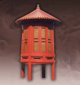 通高346厘米,檐徑210厘米,燈身上徑153厘米,下徑158厘米。圓形,傘形檐,上有寶頂。燈身上收下張。方柱形四足,燈通身紅色,四周有窗,黃緞圍里。置于祈谷壇院內(nèi)。