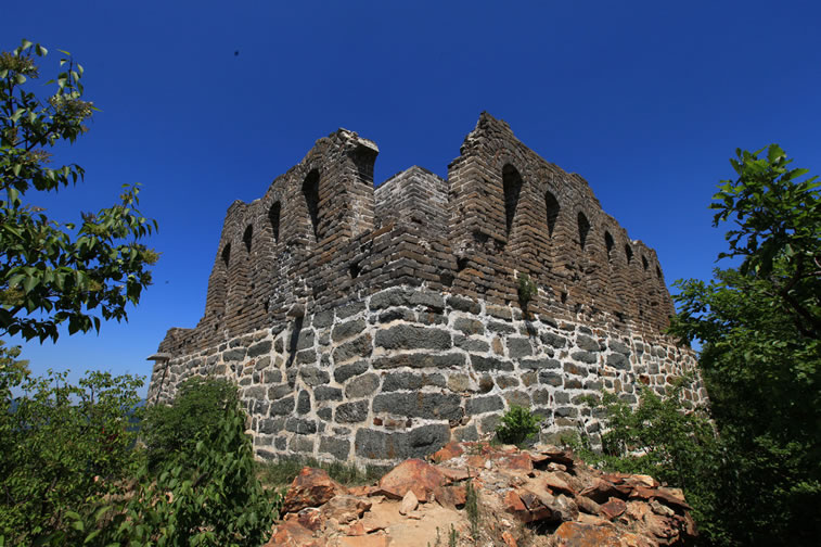 九眼樓長(zhǎng)城 九眼樓長(zhǎng)城位于四海鎮(zhèn)火焰山頂部。因敵樓每面有9個(gè)箭窗,故名。又因山勢(shì)高峻,晴天可望到北京城,故也稱望京樓。為長(zhǎng)城重要關(guān)口之一。海拔1141米,F(xiàn)樓內(nèi)有灶炕、居室遺跡,近處有馬場(chǎng)、晾馬場(chǎng)、軍營(yíng)(營(yíng)城)遺跡。樓北側(cè)有明代官員徐申于萬(wàn)歷十三年(公元1585年)巡行到該地書寫的大理石碑一方。 九眼樓為正方雙層建筑,因每邊有九個(gè)了望孔而得名,現(xiàn)存一層,高度為7.8米,每邊為13米,了望孔高1.65米,寬0.5米,內(nèi)有軍士來(lái)往巡視寬1.2米的環(huán)行步道。九眼樓下部砌石條,上部用白灰砌青色城磚,構(gòu)建十分堅(jiān)固而壯美。樓下西側(cè)有小平臺(tái),為軍士集中的場(chǎng)地。平臺(tái)北側(cè),有磚砌的臺(tái)階,沿臺(tái)階可達(dá)樓南門。樓頂為磚砌券拱式結(jié)構(gòu),樓內(nèi)寬大,可住兵儲(chǔ)器,向北開兩窗,四面各有一門,門高兩米,闊1.2米,出入極便利。 |