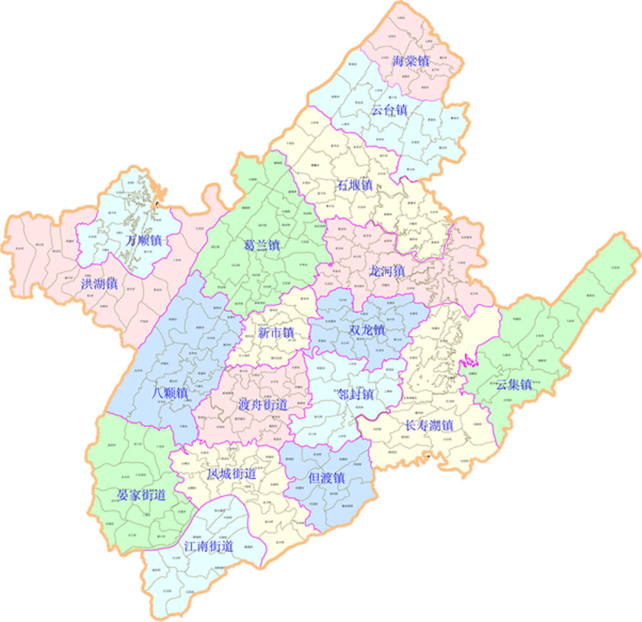 街道:菩提街道、鳳城街道、晏家街道、江南街道、渡舟街道、新市街道、八顆街道