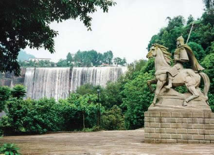天風棧道位于進入景區(qū)的大門左側,沿山體走向一直到瀑布右側,懸空,全長1058.64米。棧道離地面最高處約55米,站在棧道上可觀瀑布。2011年11月至2012年6月修建,仿木欄桿,混凝土梁柱嵌入周圍巖體1米內(nèi)。相傳,甘寧年少時組建武裝對抗官府,抗擊盜匪,由于遭到官府追殺率隊躲進山中,在懸崖峭壁間修建這條天風棧道。后來,這里的美景吸引了當?shù)氐拿浚麄兓I集重金在棧道附近增建閣樓、亭臺、懸廊等,與大瀑布相得益彰,逐漸聲名遠揚。