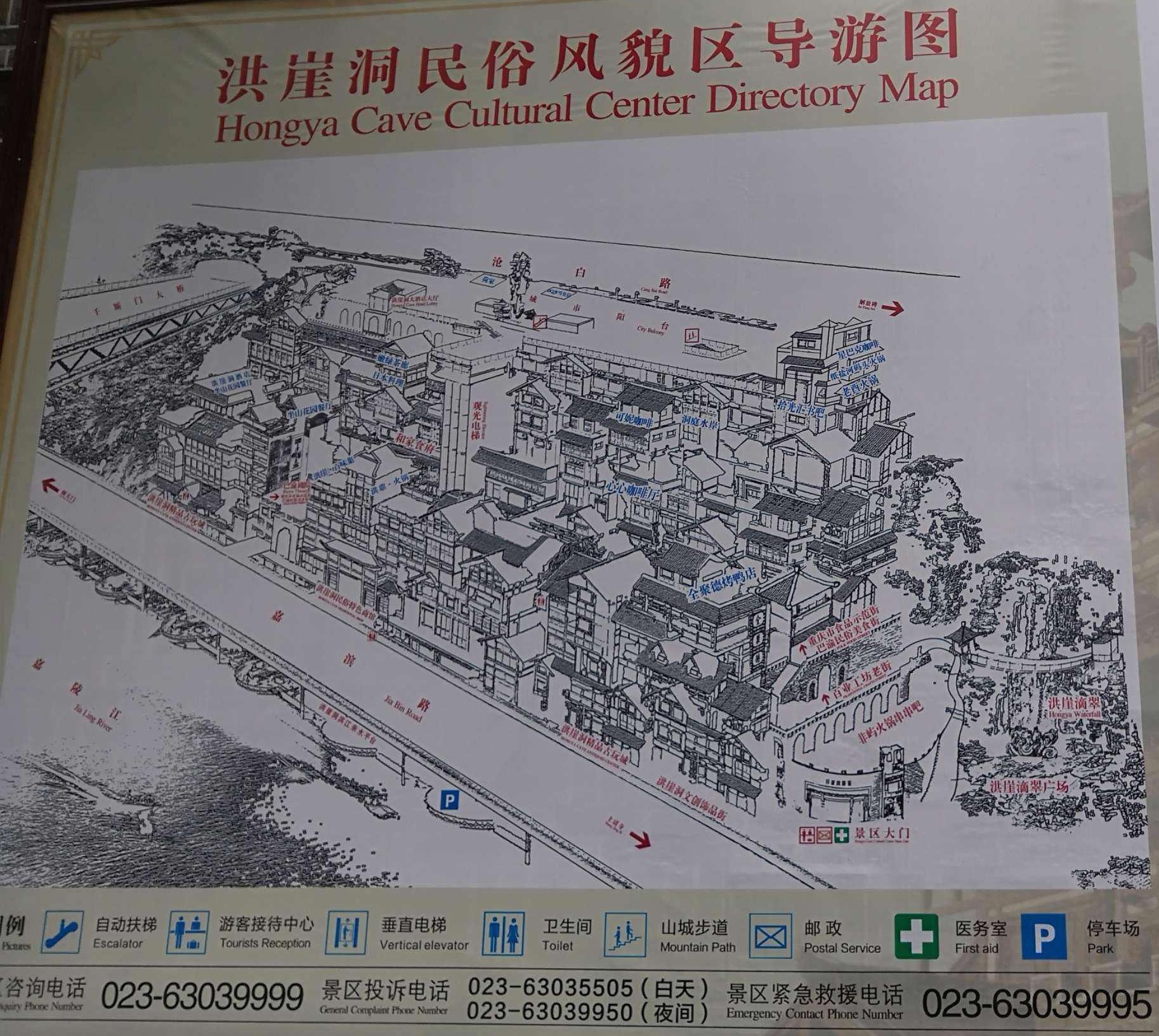洪崖洞民俗風貌區(qū)長約50米,總占地面積3.15萬平方米,分為紙鹽河精品古玩街、天成巷百業(yè)工坊老街、洪崖洞巴渝民俗美食街、洪崖洞異域美食街。有特色餐飲、休閑娛樂、巴渝民間工藝品、特色旅游商品及精品古玩等店鋪。洪崖洞一共有11層,夜晚燈光從晚上6點開燈,10點熄燈。可望吊腳群樓觀洪崖滴翠,逛山城老街賞巴渝文化,燙山城火鍋看兩江匯流,品天下美食。形成了“一態(tài)、三絕、四街、八景”的經(jīng)營形態(tài),體現(xiàn)了巴渝文化休閑業(yè)態(tài)。“一態(tài)”指的是文化休閑業(yè)態(tài)。“三絕”指的是吊腳樓、集鎮(zhèn)老街、巴文化;“四街”指洪崖洞的四條街:動感酒吧街、巴渝風情街、盛宴街美食街、城市陽臺異域風情街。四條大街分別融匯了時尚元素,主題迥異特色鮮明。成為重慶娛樂生活、夜生活的標向!鞍司啊敝傅氖呛檠碌未洹山瓍R流、吊腳樓群、洪崖群雕、城市陽臺、巴文化柱、濱江好吃街、嘉陵夕照。