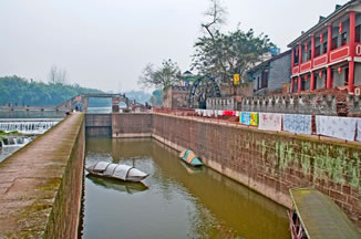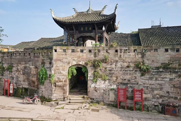 日月門:系大榮寨的四大城門之北門,門樓上有日月亭,門內(nèi)即煙雨巷,“橋橫古渡煙霞聚,寨聳雄關(guān)日月巡”。門內(nèi)有一甕形古井,深12.2米,內(nèi)設(shè)暗道通往河心,由重一噸多的石板遮蓋。該井系嘉慶年間修建的戰(zhàn)備設(shè)施,以備遭兵匪長期圍困時(shí)取水傳信之用。