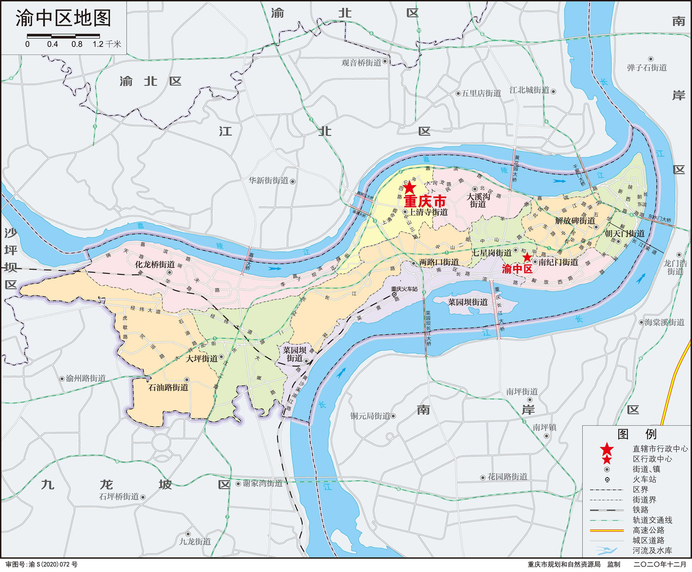 渝中區(qū)轄11個(gè)街道:七星崗街道、解放碑街道、兩路口街道、上清寺街道、菜園壩街道、南紀(jì)門街道、朝天門街道、大溪溝街道、大坪街道、化龍橋街道、石油路街道