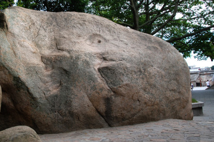人們常說,到了閩南,不到東山,是一件憾事;而到了東山,不到風動石,則更是一大憾事。的確如此。 風動巨石聳立在陡崖上,高4.37米,寬4.47米,長4.46米,重約200噸,上尖底圓,狀似仙桃,巍然“擱”在一塊臥地凸起且向海傾斜的磐石上,兩石的接觸面僅為十余平方厘米?耧L吹來時,巨石輕輕搖晃不定,人若仰臥盤石上,蹺起雙足蹬推,巨石也搖晃起來,但又不會倒下。人們站在風動石下面,有一種驚險的感覺,嘆為天下奇觀,故名“風動石”,詩曰:“風吹一石萬鈞動”。東山風動石因其“奇、險、大” 的特點而被載入《中國地理之最》,譽為“天下第一奇石”。