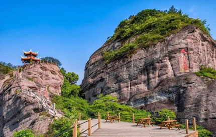 冠豸山屬于丹霞地貌,其自然形態(tài)之美在于山之奇險與幽秀,水之清冽與甘甜。遠望冠豸,山并不高。登上盤旋的山路,走過“蒼玉峽”,來到“半云亭”時,便自然產(chǎn)生“云層覺路嶺千尋”的感覺。丹梯云棧緊與半云亭相連,峭壁之上,開鑿磴道,垂直如梯,右邊是懸崖,巖色赤潤,左邊是絕谷,谷深萬丈。行走在云棧之間,有如行走在古木蒼郁的樹梢之上,行走在半空的云霧之間。