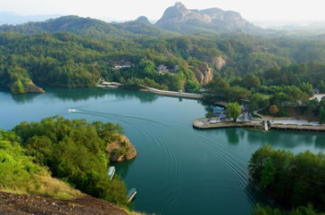 九龍湖景區(qū)左起云霄巖,右連竹安寨,面積10.84平方公里,湖水碧波蕩漾,幽深湛蘭,庫區(qū)水路迂回曲折,兩岸丹霞山巒陡峭,山奇水秀,遠看湖上群山如游龍戲水,近觀壩下湖水如玉女散珠。