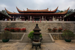 涌泉寺位于鼓山之上,占地約1.7公頃,仍保持著明清的建筑風(fēng)格。寺依山偎谷,檻廊連綴,25座大小殿堂簇擁著大雄寶殿。大雄寶殿巨柱聳立,飛檐凌空,雄偉輝煌。殿內(nèi)釋迦牟尼三世佛不著梵服,只披漢裝,端坐其中;兩旁十八羅漢神態(tài)各異,“法相莊嚴”。