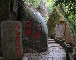 第四亭:“半山亭”。由第三亭至此,共有494級臺階。亭在半嶺,故名。過此亭百余階,有石刻“路通仙苑”,轉(zhuǎn)小徑可達“十八洞景”!鞍肷酵ぁ焙蠼300階有石刻“桃?guī)r洞口”,往東可到桃?guī)r洞,桃花精舍。