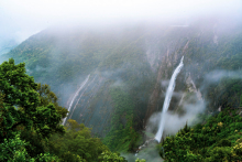 景區(qū)內(nèi)岱仙瀑布總落差約314米,單級(jí)落差184米,雄偉壯觀,被譽(yù)為“華東第一瀑”。晴天,陽(yáng)光直射,水簾發(fā)光,彩虹若隱若現(xiàn),似巨幅珠簾下垂,像彩綢飛舞,蔚為壯觀。