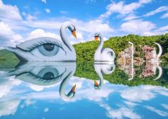 “鏡”與 “凈”的結(jié)合,置身其中,似真似幻。一片碩大的鏡面倒影著天空與山水,與周邊景點(diǎn)相輔相成。