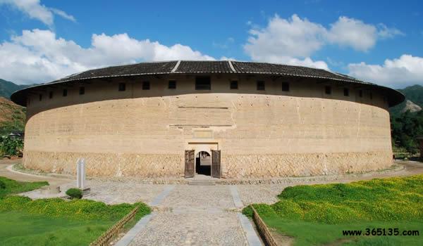二宜樓:這座被譽(yù)為"國(guó)之瑰寶"的圓土樓,座落在華安縣仙都鎮(zhèn)大地村。仙都、大地,這是多么富有詩(shī)意的名字,其實(shí)二宜樓就是人間天堂的一座民居,就是中華大地的一顆璀璨明珠。 二宜樓依山傍水,樓后峰巒疊嶂,近處山丘綿延,猶如蜈蚣緩緩爬行(風(fēng)水先生稱之為"蜈蚣吐珠地");兩條清澈的小溪在樓前交匯后,直奔西南而去。青山綠水,與黃墻黑瓦交相輝映,小橋、樓閣、翠竹、村舍點(diǎn)綴其間,渾然一體,正是"宜山宜水"的一派旖旎風(fēng)光。樓內(nèi)祖廳便有一對(duì)柱楹,專(zhuān)門(mén)概述這一景觀:"倚杯石而為屏,四峰拱峙集邃閣;對(duì)龜山以作案,二水瀠洄萃高樓。" 所謂宜山宜水,其實(shí)還隱寓樓主蔣仕熊排行第二,又是第二次擇地,才選中這蜈蚣吐珠穴位,其得意之情溢于言表。在族人的傳說(shuō)里,蔣仕熊年輕時(shí)是個(gè)種田能手,他身材高大,體格健壯,臂力超人,能使一把廿四斤重的大刀,可惜他人才超群,卻遲遲未能成家,說(shuō)是犯了"孤鸞命",注定一輩子打光棍。族人背地里取笑他說(shuō):"無(wú)某(妻)無(wú)猴,鎖匙掛褲頭。"他一氣之下出走他鄉(xiāng),到安溪、漳平等地開(kāi)墾荒田幾百畝。不久,他遇到了一個(gè)魏氏姑娘,兩人婚配后,生了六個(gè)兒子。蔣仕熊晚年衣錦返鄉(xiāng),開(kāi)始投巨資建樓,由于操勞過(guò)度,他在二宜樓尚未建成時(shí)便不幸逝世,他的六個(gè)兒子、十七個(gè)孫子繼承遺志,艱苦努力,終于在清乾隆35年(1770年)把大樓建成。