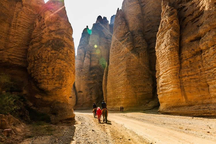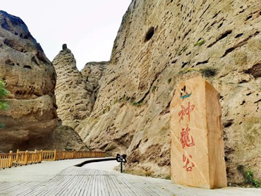 這里的石柱石筍大多高達(dá)八十至一百米之間,最高達(dá)二百多米,均由橘黃色砂礫巖構(gòu)成,鬼斧神工,猶如雕塑大師之夢(mèng)幻杰作。我們左行至飲馬溝入口,換乘當(dāng)?shù)剞r(nóng)民裝扮得極富民俗風(fēng)情的驢車前行。進(jìn)入峽谷,兩邊布滿了巨大的石筍、石人、石鐘、石崖、石窟,峰回路轉(zhuǎn),步移景變,人們將石景命名為:大象吸水、千帆競(jìng)發(fā)、伴侶駝、“黃河母親”等等,其形神兼?zhèn),栩栩如生?/p>
