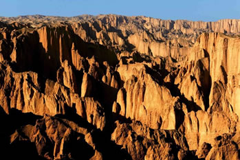 石林則依著黃河的彎轉(zhuǎn),藐著黃河的水流,這個(gè)場(chǎng)面保持著一種驚心動(dòng)魄的興奮,一看就是飛逝而去的千萬(wàn)年啊,千萬(wàn)年。老龍灣像一條長(zhǎng)長(zhǎng)的、波光粼粼的跑道,黃河拍打著細(xì)浪,從聳立的石林中,陡峭的巖石旁流過(guò)去,固執(zhí)地向干涸遙遠(yuǎn)的北方挺進(jìn)。風(fēng)吹過(guò),水涮過(guò),千萬(wàn)年的歲月,靈動(dòng)和冥想,一路歌舞狂歡。突然一剎那就是永恒。停在那里回轉(zhuǎn)的頭型,飄飛的發(fā)絲,閃逸的裙裾一下子被動(dòng)結(jié)了,面目間的笑意還沒(méi)有來(lái)及抹去。假如有一天,您也來(lái)到石林,是否會(huì)為這一片晴朗而遼闊的天空下毫無(wú)造作、天然凝就的靈魂而感動(dòng)和震撼?大自然的神筆飛揚(yáng),你縱然放開想象,馳騁神思。望尖銳或圓錐狀的山峰,基部相連的簇狀,是石林發(fā)育地貌形態(tài)。只要能夠聯(lián)想到的物象,毫無(wú)例外活生生矗立在你的眼前,仰觀景慕,活靈神現(xiàn);你沒(méi)有想到的也一幕幕向你襲來(lái),目不暇接。山峰如聚,峰嶺沸騰了一般,黃河石林以它非石非巖的特質(zhì),在這塊土地上托起一個(gè)立體的神話。雅丹、丹霞、峰林為一體的地貌奇觀寫意了恢弘的場(chǎng)景,刀鋒擁擠,千軍涌動(dòng),萬(wàn)馬奔騰,這儼如一個(gè)拼殺的戰(zhàn)場(chǎng),風(fēng)行走其間鼓動(dòng)著金屬碰撞的鏗鏘,它不再是一個(gè)夸張的舞臺(tái),場(chǎng)面不再是一個(gè)宏大的舞池。穿越石林,我們不自主地感知黃土高原的陽(yáng)剛的軀身,緘默的神態(tài),堅(jiān)毅的面容,它在風(fēng)雨中矗立,日復(fù)一日,從不愿放棄對(duì)大地的眷戀,對(duì)太陽(yáng)的向往。