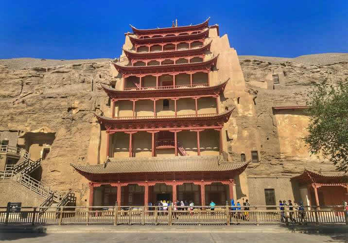 第96窟窟外木構(gòu)建筑之俗稱。唐代稱北大像。俗稱大佛殿。代表窟之一。敦煌石窟之第一大窟,建于初唐。洞窟直通崖頂,高40米,窟外有九層木構(gòu)建筑,高45米?邇(nèi)徒壁無畫,依崖塑敦煌石窟中最大塑像(高33米)的彌勒佛像。高度僅次于四川樂山石刻大佛(71米)和四川榮縣石刻大佛(36米余)。在泥塑造像中,其高度則為全國之冠。