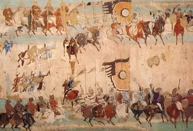 敦煌作為中西交通的樞紐,在壁畫上不僅留下了商旅來往的活動情況,還留下了寶貴的交通工具的形象資料。他們有牛馬駝騾、驢象舟船、車轎輿輦等。常用的交通工具車輛類型各異,牛車有“通牛車”、“偏牛車”、敞篷牛車,馬車有駟車、駱車,還有駱駝車、童車、獨(dú)輪車等,特別是保存了中國為世界交通做出獨(dú)有貢獻(xiàn)的獨(dú)輪車、馬套挽具(胸帶挽具和肩套挽具)、馬蹬、馬蹄釘掌等珍貴的圖像數(shù)據(jù)。西魏第285窟、北周第296窟五百盲賊皈依故事畫,表現(xiàn)了騎著戰(zhàn)馬的騎兵,與身穿褲褶的步兵(強(qiáng)盜)作戰(zhàn)的場面,畫面上畫出了馬鎧,它是保護(hù)戰(zhàn)馬的防護(hù)裝備,古稱具裝,或具裝鎧。第285窟馬鎧的形制齊全,從保護(hù)馬頭的“面簾”、到保護(hù)馬鞍后尻部的“寄生”一應(yīng)俱全。反映了漢代已有的具裝,到北朝時(shí)期已發(fā)展為玩唄成熟的保護(hù)裝備。馬鎧的產(chǎn)生和發(fā)展是中國為世界軍事裝備所作的獨(dú)有貢獻(xiàn)。