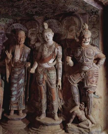 隋代短暫的三十余年中,出現(xiàn)了大量彩塑,內(nèi)容豐富,手法多樣,風(fēng)格不一。如迦葉像,有漢像,有胡像,有扁頭像,有切面像,正在探索各種人物的典型形象和新的民族風(fēng)格。唐代是敦煌彩塑的黃金時(shí)代,不僅善于造大像,更精于與人等身的群像。一鋪塑像中佛居中位,形象最大,觀音、勢至脅侍兩側(cè),僅次于佛,阿難,迦葉是佛的近侍,但由于道行果位不高,形象略小于菩薩。胡跪在蓮花上的供養(yǎng)菩薩等級更低,形象更小。踩于天王腳下的怪人(地神),則是佛國里的藥叉,形象最為卑小丑陋。在一鋪塑像中,神的身份、地位、職能和表情,各不相同,如佛的莊嚴(yán)慈祥,菩薩的溫雅嫻靜,天王的威武雄強(qiáng),力士的粗獷猛勇,供養(yǎng)菩薩的虔敬忠誠,都不僅表現(xiàn)了不同的類型性格,也透露出內(nèi)心情思。