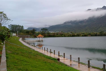 白水寨地處降雨頻密的增城北部山區(qū),充沛的降雨量不僅造就了中國內(nèi)陸第一高瀑的氣勢磅礴,也為白水寨帶來了美不勝收的湖泊風(fēng)光。瀑布從428.5米的山上飛流直下,氣勢磅礴,蔚為壯觀。瀑布源頭蒼翠、險(xiǎn)峻的群山環(huán)抱,仙姑天湖和七仙湖就像碧綠的翡翠般鑲嵌在層林疊翠間,這兩個(gè)大型的高山湖泊總?cè)萘窟_(dá)480萬立方米。在白水寨山下,瀑布流水又匯聚成一個(gè)天然的湖泊。湖水清澈,晶瑩如玉,晴朗之際,湖面宛若明鏡,將旁邊的青山密林、綠草紅花倒映其中,美不勝收。
