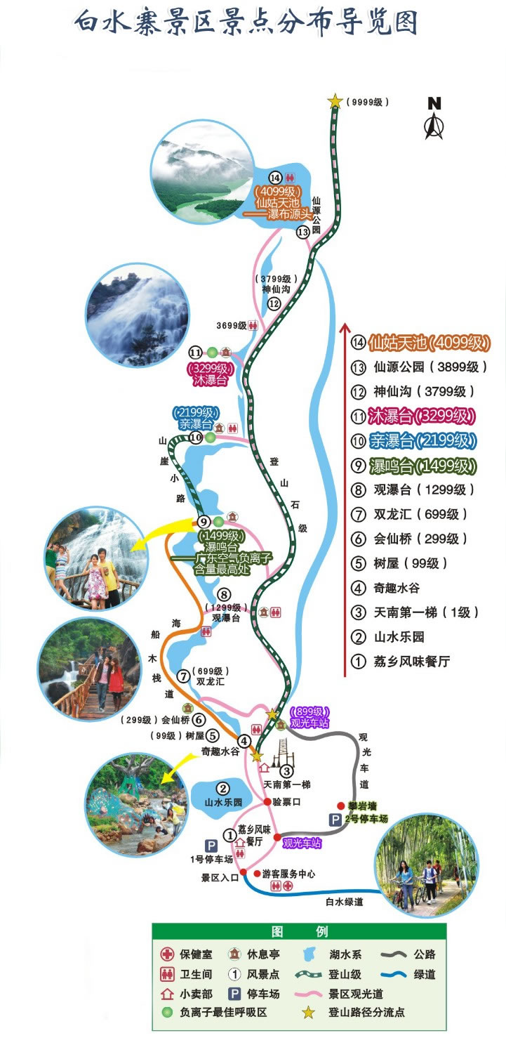 白水寨圍繞白水仙瀑及奇峰秀色,建有9999級登山步徑,總長6.6公里,19000多步,橫跨三座高山,邊接二大天池,號稱“天南第一梯”,取“勝境尋仙”、“悠閑怡景”、“知難而上”、“勇士進(jìn)取”、“登高攬勝”和“登峰如愿”之義,分“尋仙、怡景、知難、攬勝、勇士和登峰”六段梯,拾級而上盡覽天南第一梯奇觀,盡享休閑健身觀光之樂,百般風(fēng)情皆可體驗(yàn)。走過六段梯,登上9999,心想事成,強(qiáng)身健體,六六大順,長長久久。