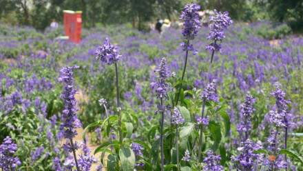 融匯日本北海道富良野的時(shí)尚文化,以薰衣草為主打色,栽植七種不同花卉,盛開色彩繽紛的花帶,黃的、紅的、金的、白的,紫色,綠的、橙的,2萬(wàn)多平方米的花海,形成一個(gè)巨型的七彩花帶,構(gòu)成一幅大地上的七色彩虹,生動(dòng)而美麗。