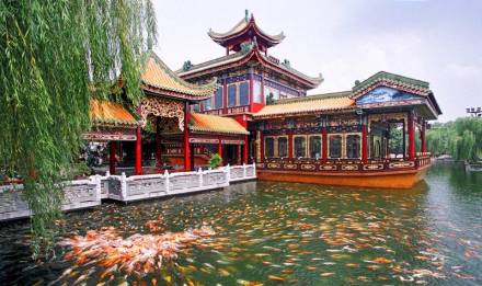 船頭上的大型木雕“百鳥朝鳳”更是栩栩如生,金碧輝煌。100只鳥兒,各具風(fēng)姿,舫內(nèi)擺設(shè),全由花梨和酸枝木精工制成,宮廷式的幾椅,配以仿宋代器皿,豪華奪目!熬弄{會金龍”大型屏風(fēng)和《清明上河圖》精彩片段的雕刻,造工精湛,更稱精品。舫內(nèi)一樓,是可容40人品茶聽曲的場所,以演奏廣東音樂和粵曲為主。