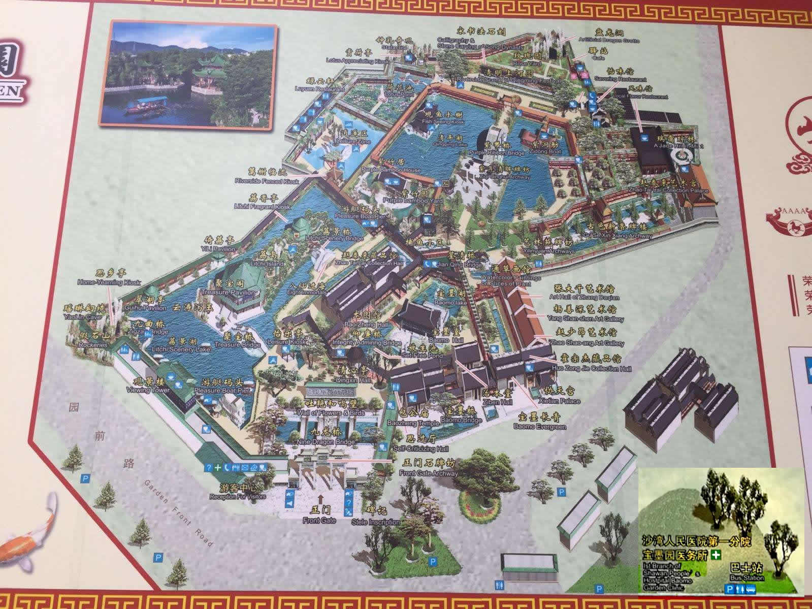 寶墨園內(nèi)共有治本堂、寶墨堂、清心亭、仰廉橋、紫洞舫、龍圖館、千象回廊和風(fēng)味食街這8大景區(qū),40多個景點(diǎn),30多座石橋,河湖眾多,流水縱橫,建筑、園林、山水、石橋。陶塑、灰塑、石雕、磚雕、木雕、石刻、彩繪、嵌瓷等藝術(shù)精品琳瑯滿目,各展館珍藏、陳列了大批文物古董和名家的書畫。