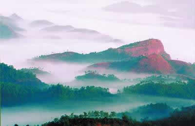 丹霞山主峰海拔409米,它與眾多名山相比遠(yuǎn)不算高,也不算大,但它集黃山之奇、華山之險、桂林之秀一身,具有一險、二奇、三美的特點。風(fēng)景區(qū)劃分為上、中、下三層以及錦江風(fēng)景區(qū)、翔龍湖和有被譽(yù)為天下第一奇景的陽元山,上層是三峰聳峙;中層以別傳寺為主體;下層以錦石巖為中心。三百多年前澹歸和尚在丹霞山開辟別傳寺時,曾挑出12處風(fēng)景,命名丹霞十二景:錦水灘聲、玉臺爽氣、杰閣晨鐘、丹梯鐵索、舵石朝曦、竹坡煙雨、雙沼碧荷、乳泉春溜、累頂浮圖、虹橋擁翠、片鱗秋月。