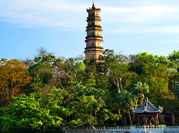 泗洲塔位于廣東惠州西湖西山,是湖上最古老建筑物。始建于唐中宗年間,為紀(jì)念泗洲大圣僧伽而筑,北宋文學(xué)家蘇軾謫居惠州時(shí)稱之為大圣塔。明嘉靖四十三年(1564年)塔毀,明萬歷初年改建亭,明萬歷四十六年(1618年)復(fù)建塔。光緒初年,雷破塔頂一角,長了一株榕樹,清代愛國詩人丘逢甲詩云:“行人欲問朝云墓,看取亭亭塔頂榕”。山上綠樹成蔭,亭廊排映,景色秀麗。蘇東坡寫的《江月五首》“一更山吐月,玉塔臥微瀾”的著名詩句指的正是此塔。泗洲塔明代后建至今,已有整整403年古老歷史,是惠州現(xiàn)保存最完善古老的珍貴建筑物之一;葜葶糁匏粡V東省人民政府批準(zhǔn)并公布為第八批廣東省文物保護(hù)單位。