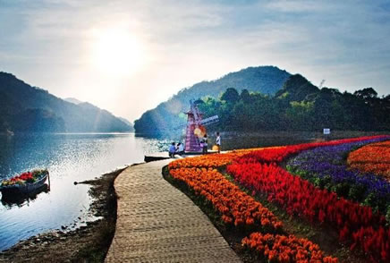 “夏日花!笔鞘铒L(fēng)光區(qū)的天池花海景點的夏日特色花海,位于海拔800多米的石灶天池之畔,面積近百畝。“夏日花!庇苫鸺t燦爛的一串紅、花中之禽雞冠花、英雄之花紅穗冠、香草之后薰衣草組成,與原始次生林、水生植物園和天池編織出一幅如童話世界般的美麗畫卷。特別是單一紫色花朵代表真愛的薰衣草,總是能讓人聯(lián)想到溫馨的浪漫。