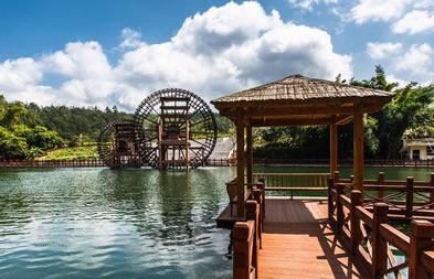 位于八寨溝景區(qū)大門外,是一個(gè)人工湖,湖面寬廣,三面環(huán)山,景色秀麗,可乘木船游覽龍珠湖風(fēng)光,混凝土大壩外有人工瀑布,瀑布下面是深水潭,有一架仿古大水車,在流水驅(qū)動(dòng)下不停轉(zhuǎn)動(dòng)。