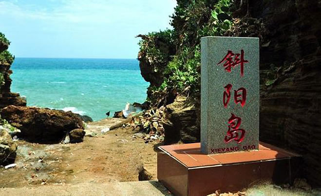 斜陽(yáng)島,位于潿洲島東南海面上,亦由火山噴發(fā)堆積形成,距潿洲島9海里,距北海市區(qū)44海里,面積1.89平方公里。因從潿洲島可觀太陽(yáng)斜照此島全景,又因該島橫亙?cè)跐迧u東南面,南面為陽(yáng),故稱斜陽(yáng)島。島上冬暖夏涼,野花繁多,森林原始,山徑迷離,海蝕、海積及溶巖景觀奇特。斜陽(yáng)島上住著200多客家人。