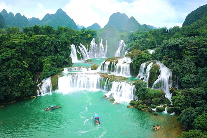 德天跨國(guó)瀑布位于祖國(guó)西南邊陲——廣西崇左市大新縣,開門是越南,跨步進(jìn)東盟,是2015年11月中越兩國(guó)總書記見證簽約的中國(guó)首個(gè)跨境旅游合作區(qū)。距廣西首府南寧約196公里,距大新縣57公里,距紅色革命老區(qū)百色188公里,奇特的喀斯特地貌和自然山水風(fēng)光,被稱為中越邊境的百里山水畫廊。景區(qū)占地面積約5.75平方公里,橫跨中越兩國(guó),形成中國(guó)的德天瀑布,越南的板約瀑布。因景觀獨(dú)特被譽(yù)為亞洲第一大跨國(guó)瀑布、中國(guó)最美的六大瀑布。 德天跨國(guó)瀑布于1992年對(duì)外開放,2018年榮膺國(guó)家5A級(jí)旅游景區(qū),中越兩國(guó)以德天瀑布至碩龍鎮(zhèn)14.5公里的歸春河為天然國(guó)界,歸春河發(fā)源于廣西靖西縣鵝泉,全長(zhǎng)150公里,途經(jīng)越南,迂回35公里后又復(fù)入碩龍鎮(zhèn)德天村,“歸國(guó)遇春”便是當(dāng)?shù)卮迕褓x于它的美好寓意。歸春河經(jīng)大新縣德天村處被峙在江心的浦湯島所阻擋,使河水激石咆哮,奪路而下,遇斷崖跌落而形成高低落差不同的三級(jí)疊瀑。瀑布橫跨中、越兩國(guó),寬約200米,縱深60米,落差達(dá)70米,層層跌落,水勢(shì)激蕩,氣勢(shì)磅礴,是東南亞最大的天然瀑布,年均徑流量達(dá)每秒55.2立方米,約為貴州黃果樹瀑布的三倍,被稱之為“天然氧吧”。