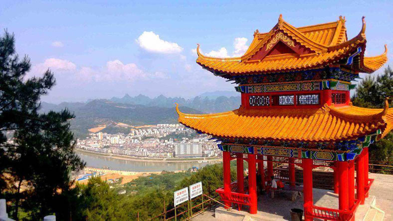 金子嶺位于漓江、荔江、茶江匯合處,與平樂縣城相對高度約600米。金子嶺觀景閣建筑風格為南派大翹角多角式樓閣建筑,建設采用鋼筋混凝土現(xiàn)代建筑材料,仿明清時代大木結構手法制作,主閣樓總高度44.83米,外觀結構為五層,內部結構為九層,總建筑面積為2134.05平方米,其中底層建筑面積為813.43平方米。