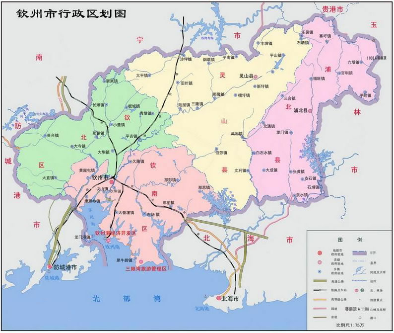 欽北區(qū) 面積2217平方千米,人口720442,政府駐欽州灣大道156號(hào),下轄3個(gè)街道、11個(gè)鎮(zhèn)