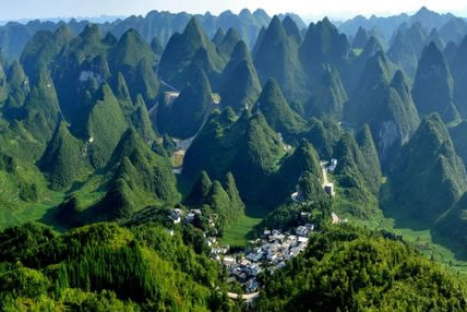 從地質(zhì)學(xué)的角度看,北部為峰林盆地,中南部為峰林洼地和峰叢山地,峰林、峰叢大多為呈錐形,部分為鐘狀、平頂狀和馬鞍狀,堪稱一座“中國錐狀喀斯特博物館”。南北兩段峰林也各具特色,北部峰林如同一道屏風(fēng),護佑著耳寨、魚隴、雙生、樂立一帶的村寨田園。這里奇峰如林,田壩似錦,河水如帶,村寨如云,充滿詩情畫意,恰似一幅樸素、清麗的布依族織錦。