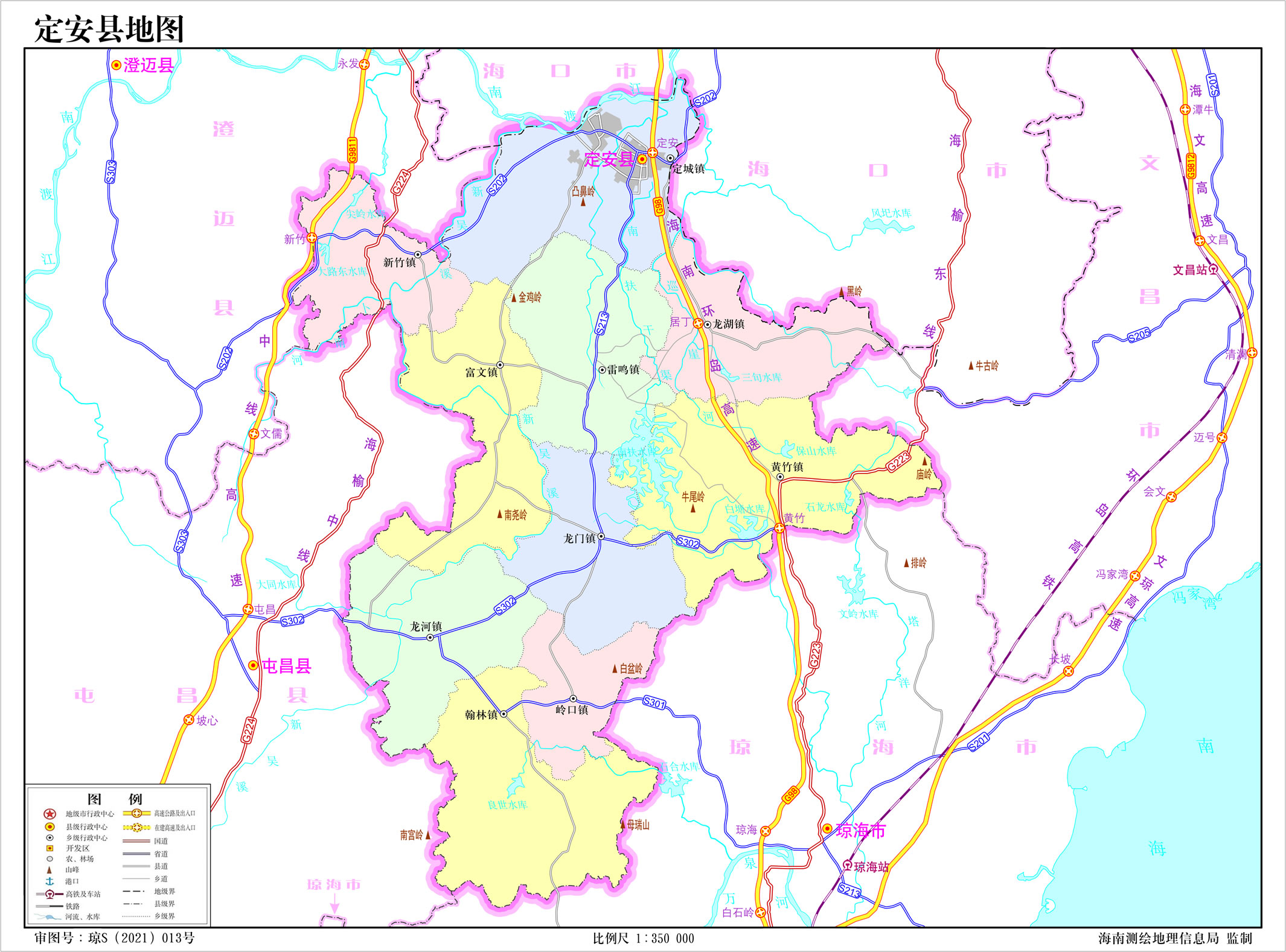 定安縣轄10個(gè)鎮(zhèn):定城鎮(zhèn)、新竹鎮(zhèn)、龍湖鎮(zhèn)、黃竹鎮(zhèn)、雷鳴鎮(zhèn)、龍門鎮(zhèn)、龍河鎮(zhèn)、嶺口鎮(zhèn)、翰林鎮(zhèn)、富文鎮(zhèn)
